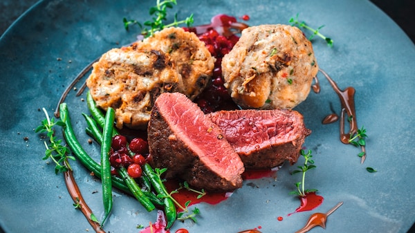 - Weißes Kaninchenragout / Tagliatelle / gelbe Bete *** Duett vom Wild (Hirsch & Gams) / Blaukraut /Quitte / Kartoffeltörtchen
