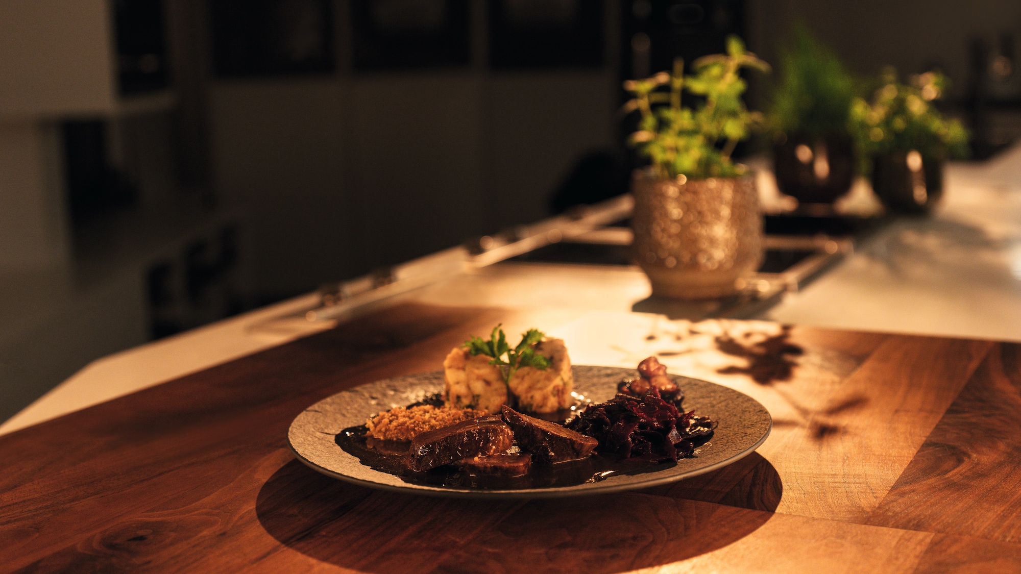 Volkers Culinary Secret ist ein Duett vom Hirsch mit Portweinzwiebeln, Rotkohl und Pilzknödeln.