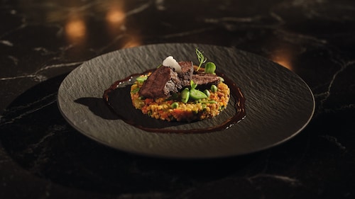 Ralfs Culinary Secret ist geschmorrtes Kalbsbäckchen auf Paella mit Chorizo und Buchweizen.