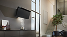 Wer auf eine Kopffrei-Dunstabzugshaube setzt, findet die passende Lösung in dem Modell mit Glas-Paneel in Obsidianschwarz matt. Elegant und reduziert wirkt der Haubenkörper, denn er hat eine geringere Tiefe und Höhe als die bisherigen Modelle. Zudem hat der Glasschirm nun einen steileren Winkel und bietet großgewachsenen Menschen damit noch ein wenig mehr Bewegungsfreiheit beim Kochen.