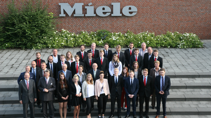 Die jungen Fachkräfte mit Dr. Markus Miele und Dr. Reinhard Zinkann sowie Miele-Personalchef Michael Bruggesser, Ekkehard Härtel (Leiter Personal Standort Gütersloh), Stefan Randerath (Gruppenleiter Personal Standort Gütersloh), Ausbildungsleiter Thomas Meyer sowie den Ausbilderinnen und Ausbildern.
