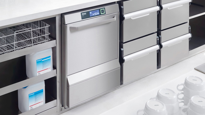 Maximale Reinigungsleistung bei sparsamem Energieverbrauch: Die Haubenspüler von Miele Professional sind mit Wärmetauschern ausgestattet und sparen dadurch Stromkosten – bis zu 20 Prozent in der abgebildeten „Eco“-Variante.
