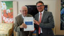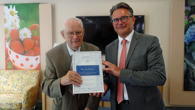 Preisverleihung im bayerischen Ansbach: Oswald Weisner (links) erhielt von „Klasse Wäsche“-Sprecher Martin Hübner eine Urkunde für den ersten Platz im Geschichtenwettbewerb „Mein liebstes Kleidungsstück“.