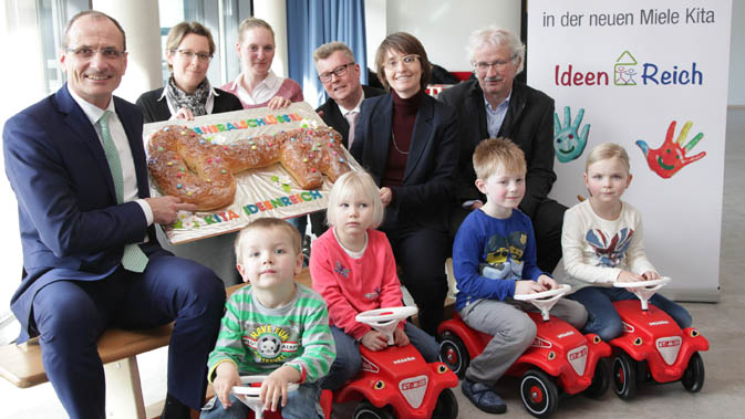 Für Miele ist sie ein Meilenstein für die Vereinbarkeit von Familie und Beruf, für bald 60 Kinder einfach ihre neue, tolle Kita. Das „IdeenReich“ nahm heute planmäßig seinen Betrieb auf. Miele-Geschäftsführer Olaf Bartsch überreichte den symbolischen Schlüssel für das neue Gebäude an Britta Hüfing vom pme Familienservice, dem Träger der Einrichtung. Sie nahm ihn stellvertretend für Kita-Leiterin Sabine Peters entgegen, die erkrankt war.