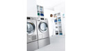 Den späteren Trocknungsprozess verkürzt eine besonders effektive Entwässerung aller Textilien beim Schleudern, wo jetzt ein g-Faktor von 704 erreicht wird. Das ist ein Drittel mehr als bei der Vorgängergeneration – und führend im Markt. Trotz deutlich erhöhter Schleuderdrehzahl bleibt die Laufruhe gleich, und dies kommt im Zusammenspiel mit hochwertigen Bauteilen wie Heizkörpern aus korrosionsbeständigem Material der Langlebigkeit zugute: Die neuen Kleinen Riesen sind erfolgreich für eine Betriebsdauer von 30.000 Stunden getestet worden.