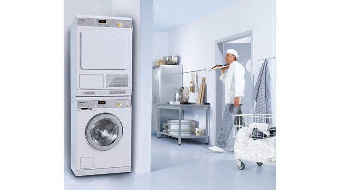Waschmaschine und Trockner können als Wasch-Trocken-Säule platzsparend aufeinandergestellt werden. Die Bedienung per Drehwahlschalter und Symbolblende ist ebenso einfach und intuitiv wie bei den Miele-Haushaltsmaschinen. Ein Programmdurchlauf dauert nur 79 Minuten. Martin Hübner: „Dieses Tempo bei zugleich tadellosem Waschergebnis gibt es wiederum nur bei Gewerbegeräten.“