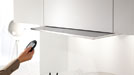 Eine Besonderheit der 60 und 90 Zentimeter breiten Flachpaneelhauben (DA 3660 und DA 3690) ist, dass die Geräte im ausgeschalteten Zustand unsichtbar hinter der Küchenfront verborgen sind. Erst durch Einschalten des Kochfeldes oder mit einem Druck auf die mitgelieferte Fernbedienung fährt der 14 Millimeter flache Wrasenschirm motorisch angetrieben aus dem Oberschrank. Dank der sehr kompakten Bauweise können diese Hauben sogar in nur 35 Zentimeter hohe Oberschränke eingebaut werden.