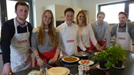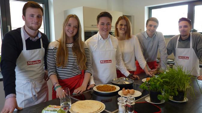 Als Produktentwickler testen die Miele-Azubis im Filmbeitrag automatische Kochprogramme: (v.l.) Felix Ofenbach, Leonie Stappers, Christian Krämer, Victoria Weiß, Yassin Bischoff, Julian Hunger.