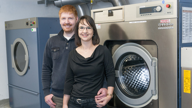 Erfolgreich mit eigenem Energiemanagement: Hotelier Christian Berwanger und seine Frau Conny in der eigenen Wäscherei, die seit 45 Jahren mit Miele-Technik ausgestattet ist.