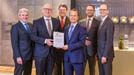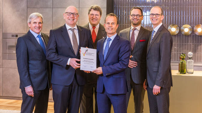 Miele ist Branchenbester seit 25 Jahren: Diese seltene Auszeichnung für kontinuierlich hohe Servicequalität überreichten Dr. Frank Dornach, Vorstandschef der ServiceBarometer AG (li.) und Vorstandskollege Matthias Metje (re.) in Gütersloh. Hierüber freuten sich (v. li.) Frank Jüttner (Leiter Vertriebsgesellschaft Deutschland), Dr. Reinhard Zinkann (Geschäftsführender Gesellschafter), Guido Geller (Leiter Kundendienst Deutschland) und Dr. Axel Kniehl (Geschäftsführer Marketing und Vertrieb). (Foto: Miele)