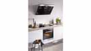Dem Prinzip der Kopffrei-Haube folgt auch die DA 6796 Shape. Wie bei der Black Wing und White Wing entfällt auch hier der Kamin. Vorteil: Die eleganten Konturen, die dieser Haube ein unverwechselbares Design verleihen, kommen besser zur Geltung. Als Gestaltungsmittel dienen fünf 90 Zentimeter breite Glaspaneele in Obsidianschwarz, die den Haubenkörper verkleiden. In das oberste Paneel ist die Bedienung als Touch-on-glass-Leiste eingearbeitet. Optisch wie funktional entspricht das der Bedienphilosophie der aktuellen Einbaugeräte-Generation 6000. Insbesondere in der Kombination mit Geräten in EdeIstahl CleanSteel und Obisidianschwarz entsteht so ein Ensemble, das sehr hohe Wertigkeit und Eleganz ausstrahlt.