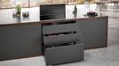Black Levantar spart Platz im Unterschrank: Dank der lediglich noch 17 Zentimeter tiefen Gebläse-Einheit müssen die Auszüge unter der Kochstelle nur minimal gekürzt werden. (Foto: Miele)