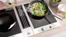 Individuelle Kochstelle mit integriertem Dunstabzug: Miele bietet CombiSet-Module – hier ein Induktionswok und ein Induktionskochfeld – in verschiedenen Sets mit einem Muldenlüfter an.