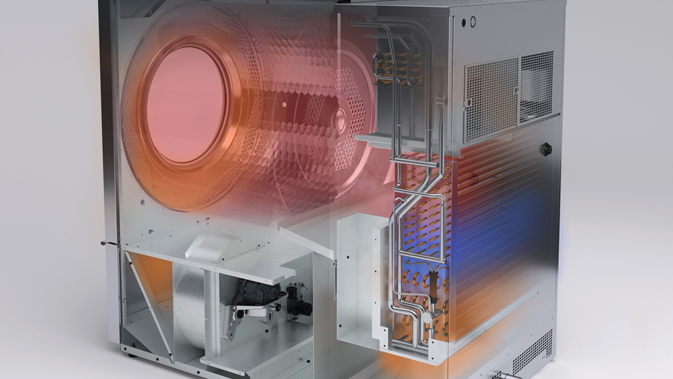 Abluftleitung überflüssig: In Trocknern mit Wärmepumpenmodul steht die erwärmte Luft für den nächsten Trockenprozess zur Verfügung. Dadurch lässt sich der Stromverbrauch deutlich reduzieren – gegenüber Geräten in konventioneller Bauweise um mehr als die Hälfte. (Foto: Miele)