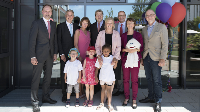 Hier, das ist im Neubau direkt gegenüber vom Gütersloher Stammwerk. Nach knapp zwei Jahren Bauzeit nahm die Einrichtung im März die ersten Kinder auf; am Dienstag feierten die Kita-Kinder mit ihren Eltern, Geschwistern und allen Beteiligten die offizielle Eröffnung, insgesamt etwa 220 Gäste. Mit dabei Vertreter der Geschäftsleitung – Olaf Bartsch, Geschäftsführer Finanzen/Hauptverwaltung, die Geschäftsführenden Gesellschafter Dr. Markus Miele und Dr. Reinhard Zinkann; als besondere Gäste Dr. Peter Zinkann und Dr. Karin Zinkann und Bürgermeister Henning Schulz, der sich an die Zeit als junger Vater und die Probleme mit den Schließungszeiten der Kita erinnerte. Die Eltern der Miele-Kita haben es da leichter: Das „IdeenReich“ ist bis 18 Uhr abends und ganzjährig geöffnet. Schließlich soll die neue Kita vor allem eines: Den Eltern, in der Mehrzahl Miele-Mitarbeiterinnen und Mitarbeiter, die bessere Vereinbarkeit von Familie und Beruf ermöglichen. Dafür hat das Unternehmen 3,5 Millionen Euro in die Kita investiert, die Kosten für den Gesamtkomplex mit Wohnungen, Büros und Tiefgarage belaufen sich auf 7,2 Millionen Euro.