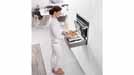 Die Vakuumierschublade ist auf das Design der Einbaugeräte-Generation 6000 abgestimmt und so äußerlich von einer Miele-Wärmeschublade nicht zu unterscheiden. Mit einer Blendenhöhe von 14 Zentimetern eignet sie sich zur Kombination mit diversen Kompaktgeräten und füllt dann die klassische 60er Backofennische aus. Die Vakuumkammer wird erst beim Aufziehen der Schublade sichtbar.