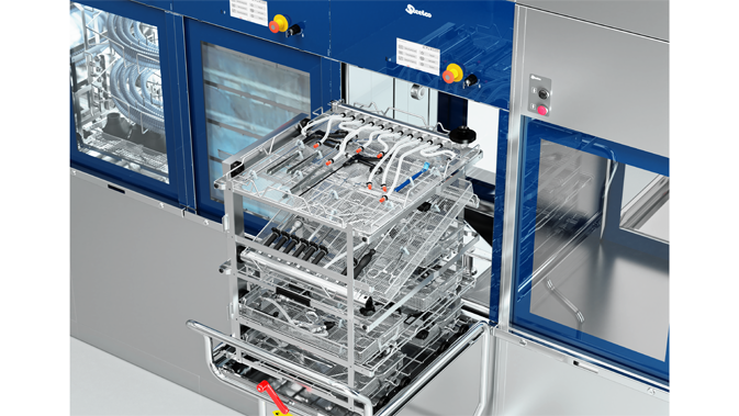Neu in den SlimLine Reinigungs- und Desinfektionsautomaten von Steelco: das PowerPulseCleaning-System. Es reinigt bis zu elf Hohlkörperinstrumente pro Charge mit Wasser- und Luftstößen von innen und außen (Foto: Steelco)