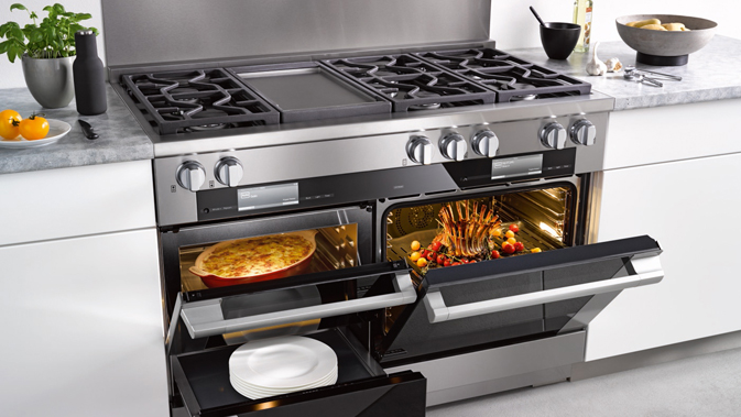 Gespannt ist man bei Miele auch auf die Resonanz der Messegäste auf die neuen Range Cooker, Kochgeräte in US-amerikanischen Dimensionen mit der Qualität und Ausstattungsdetails, die auch die Einbaugeräte der Generation 6000 auszeichnen. Die Range Cooker sind großformatige Herde, darunter ein 1,22 Meter breites Standgerät (48 Zoll), das für amerikanische Verhältnisse eine bisher nicht bekannte Anwendungsvielfalt bietet. Im Detail sind das zwei Garräume, einer davon auch als Mikrowelle nutzbar, sechs Gasbrenner, ein sogenannter Griddle – eine Edelstahlfläche für das Grillen – sowie eine Wärmeschublade.