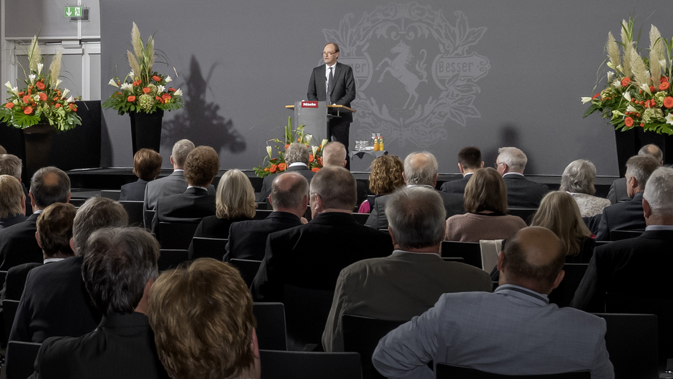 Dr. Markus Miele hält die Festrede zur Jubiläumsfeier im Miele-Forum. |