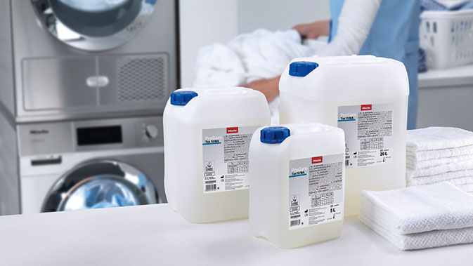 Leistungsstark und für die Ansprüche unterschiedlicher Zielgruppen entwickelt: Waschmittel, die in Gewerbewaschmaschinen von Miele aller Größen eingesetzt werden können. (Foto: Miele)