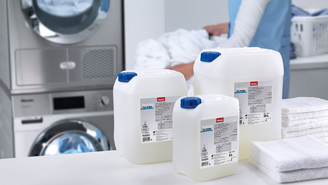 Leistungsstark und für die Ansprüche unterschiedlicher Zielgruppen entwickelt: Waschmittel, die in Gewerbewaschmaschinen von Miele aller Größen eingesetzt werden können. (Foto: Miele)