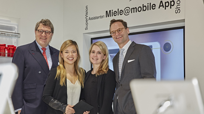 Miele und Kitchen Stories verkünden exklusive Kooperation: Hier begrüßen die Miele Geschäftsführer Dr. Reinhard Zinkann (li.) und Dr. Axel Kniehl die beiden Gründerinnen Mengting Gao (2.v.li.) und Verena Hubertz auf der LivingKitchen.