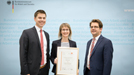 Thorben Albrecht, Staatssekretär im Bundesministerium für Arbeit und Soziales (rechts), beglückwünschte Ursula Wilms (Nachhaltigkeits-kommunikation) und Sebastian Wegener (Nachhaltigkeitsmanagement) zum zweiten Platz für Miele im Ranking der Nachhaltigkeitsberichte. Foto: Gordon Welters/IÖW