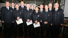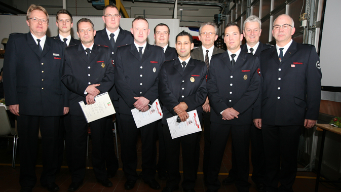 Die beförderten und ausgezeichneten Kameraden mit Regierungsbranddirektor Karsten Weber (links), Dr. Ernst Krämer (Leiter Miele Werk Gerätefertigung, 4.v.r.), Wehrleiter Uwe Theismann (2.v.r.) und seinem Stellvertreter Andreas Zurmühlen (r.).