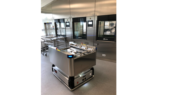 Um die Arbeitsabläufe bei der Aufbereitung von Medizinprodukten zu erleichtern, bietet Steelco als Ergänzung zu seinen Beladesystemen für Reinigungs- und Desinfektionsgeräte sowie Sterilisatoren ab Ende 2022 ein automatisches Transfersystem (kurz M-ATS) an. Herzstück sind Transportroboter, die sich auf der reinen und unreinen Seite frei im Raum bewegen und die Geräte selbstständig be- und entladen. Mit einer Tragkraft von bis zu 150 Kilogramm nehmen sie dem Fachpersonal schwere Arbeiten ab und erleichtern die Transportprozesse in einer Aufbereitungseinheit für Medizinprodukte (AEMP).