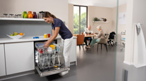 Die Seniorenresidenz De Medemens St. Bavo im belgischen Antwerpen setzt auf Hygiene und zugleich auf die Integration der Bewohnerinnen und Bewohner in den Tagesablauf. Der Mittelpunkt jeder Wohngruppe ist die Küche, wo auch Unterstützung gern gesehen ist – etwa beim Ausräumen der Spülmaschine. Die sieht fast so aus wie ein Gerät, das viele von zu Hause kennen, kann aber mehr und bereitet sogar wiederverwendbare Flaschen auf. Miele Professional hat dafür einen speziellen Unterkorb entwickelt, der mit wenigen Handgriffen eingesetzt ist.
