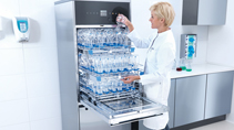 Mit dem Zubehörprogramm EasyLoad senkt Miele den Beladungsaufwand für seine Laborspüler und schützt das Spülgut vor Beschädigung. Laborglas wird jetzt automatisch richtig im Beladungsträger positioniert, und die neu entwickelten Injektordüsen gewährleisten eine gründliche Innenreinigung von Glas verschiedenster Formen und Größen – von Reagenzgläsern bis hin zu Erlenmeyerkolben.