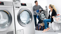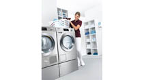 Im Waschsalon will niemand lange warten. Wäschereimaschinen sind deshalb viele Stunden in Betrieb, müssen robust und pflegeleicht sein – und gleichzeitig schnell. Wie die Kleinen Riesen von Miele, die sich seit mehr als 40 Jahren überall dort bewähren, wo Maschinen für Privathaushalte an ihre Grenzen stoßen. Im April werden die Waschmaschinen und Trockner durch zwei grundlegend neue Baureihen abgelöst: Wie bisher kommen die Geräte mit einem halben Quadratmeter Platz aus, können aber mit mehr Textilien beladen werden. Dabei sinkt der Verbrauch von Strom und Wasser, und mit einem neuen Touch-Display wird die Bedienung wesentlich einfacher.