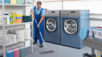 Wo täglich große Mengen Mopps und Wischtücher auf kleinem Raum sauber werden müssen, bewähren sich Kleinen Riesen von Miele: Kompakte Waschmaschinen und Trockner, die auch unter dem Namen „Mopstar“ bekannt und – je nach Modell – für sechs bis acht Kilogramm Reinigungstextilien verfügbar sind. Die neuesten Geräte, die es erst seit wenigen Monaten gibt, können gekauft, gemietet oder geleast werden.