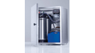 So ist hinter der abschließbaren Tür genug Platz für zwei Teil- oder Vollentsalzungspatronen, zwei Dosiermodule und zwei Kanister für flüssige Medien bis zehn Litern Inhalt. Dies können zum Beispiel Reiniger und Klarspüler sein, die Miele Professional unter dem Namen „ProCare Shine“ selbst anbietet. Um eventuell austretenden Wassertropfen oder Reinigungschemikalien vorzubeugen, wurde der Schrank mit einer Bodenwanne ausgestattet. Ein weiteres praktisches Detail: Müssen die Entsalzungspatronen ausgetauscht werden, die je nach örtlicher Wasserqualität für fleckenlosen Glanz unverzichtbar sind, erfolgt eine akustische Anzeige. Zusätzlich weist eine Leuchtdiode am Türrahmen auf den erforderlichen Patronenwechsel hin.