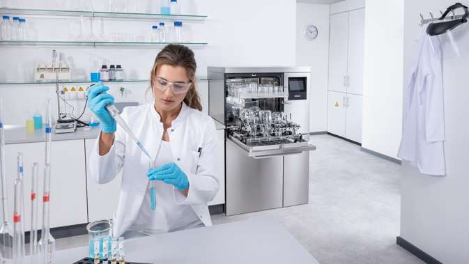 Für sichere und reproduzierbare Ergebnisse: Prozesschemikalien der Serie ProCare Lab, speziell für Miele-Laborspüler entwickelt, unterstützen die zuverlässige Aufbereitung unterschiedlichster Laborgefäße. (Foto: Miele)