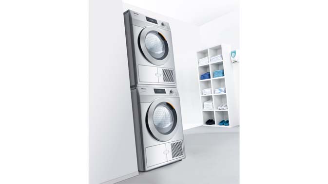 Für das Geräteensemble verwendet Miele zwei Wärmepumpentrockner der Reihe „Kleine Riesen“. Sie sind mit einem Verbindungssatz sicher installiert, bieten je 130 Liter Trommelvolumen und trocknen zwei Mal acht Kilogramm Wäsche in nur 77 Minuten*. Dabei liegt der Energieverbrauch um circa 50 Prozent unter dem von Ablufttrocknern. Das minimiert Betriebskosten und schont die Umwelt.