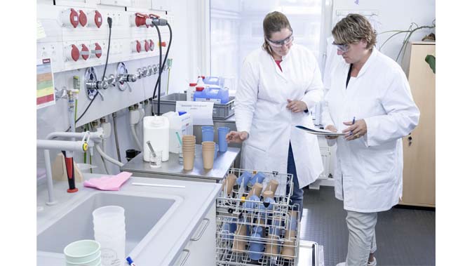 Neben dem Anspruch, für Endkonsumenten ein Höchstmaß an Sicherheit im Alltag zu gewährleisten, steht für die Expertin das Thema „Benutzerfreundlichkeit“ im Mittelpunkt. Mit ihrer Kollegin Mathilde van Rheenen probiert sie deshalb aus, unter welchen Bedingungen eine gewerbliche Spülmaschine Mehrwegbecher nicht nur hygienisch reinigt, sondern am Ende auch zuverlässig trocknet. Dafür sorgt ein spezieller Korb mit passenden Halterungen. Er wurde im CSA-Labor anwendungstechnisch getestet und ist mittlerweile auf dem Markt. Oft stehen auch Becher von verschiedenen Herstellern, deren Restfeuchte unter Realbedingungen zu testen sind, auf dem „Prüfstand“.