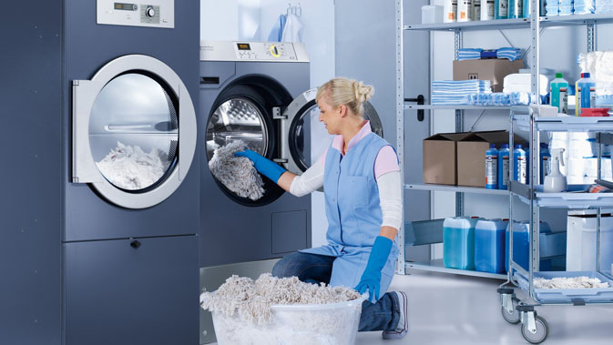 Waschmaschine und Flusenfilterkasten sind Bestandteil der Miele-Systemlösung für effektive Gebäudereinigung. Dazu gehören unter anderem die Planung einer kompletten Wäscherei, die Einweisung von Anwendern an der Maschine und auf Wunsch auch Miet- und Leasingsangebote.