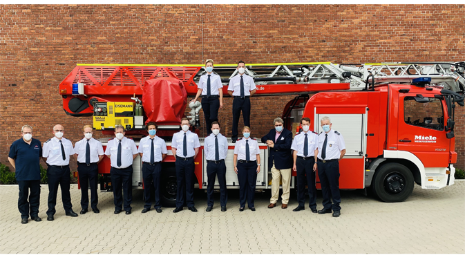 Die Beförderungen und Ehrungen nahm Dr. Reinhard Zinkann, Geschäftsführender Miele-Gesellschafter, vor. Auch Peter Kesselmeier, Leiter Cross-Plant Services am Standort Gütersloh, gratulierte. Torben Jeß, Till Kleinsteuber und Niklas Zurmühlen absolvierten die Grundausbildung zum Feuerwehrmann. Sebastian Sagemüller wurde zum Oberfeuerwehrmann ernannt. Dr. Nicole Busch wurde zur Unterbrandmeisterin und Tobias Schattschneider zum Unterbrandmeister befördert. Nach einem Lehrgang am Institut der Feuerwehr NRW in Münster legten Jeannette Theilmeier die Prüfung zur Brandinspektorin und Konstantinos Tsirogiannis die Prüfung zum Brandinspektor ab. Für 40-jährige Mitgliedschaft im aktiven Dienst der Werkfeuerwehr wurde Norbert Handwerk ausgezeichnet. Andreas Cieplik erhielt die Anerkennung für seine 10-jährige aktive Mitgliedschaft.