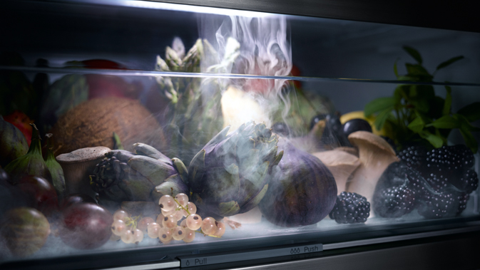 PerfectFresh Active von Miele für den extra Frischekick: Ein feiner Sprühnebel verteilt sich gleichmäßig in der Frischeschublade. Im Zusammenspiel mit niedrigen Temperaturen bleiben Obst und Gemüse bis zu fünf Mal länger frisch. (Foto: Miele) |