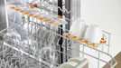 When it comes to cutlery, Miele customers have a choice of classical cutlery basket and patented 3D+ cutlery drawer. This includes two small hinged rows of spikes in the central section which can be folded down flat to accommodate larger items such as a large soup ladle. The new spikes ensure that long, slender items such as cook's knives and salad servers are securely positioned and thoroughly washed and dried on all sides. Besides this, the side racks both slide in towards the centre, allowing more space along the sides for tall items of stemware in the upper basket below.