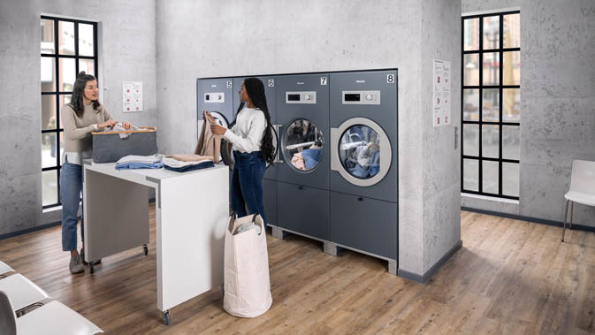 Nobody wants to hang around long in a launderette. As a result, washing machines and dryers are in operation many hours a day, have to be fast and robust and easy to maintain. Connected machines from Miele make for error-free and convenient operation and leave nothing to be desired in terms of individual laundry care. The life of operators of launderettes is simplified by digital interfaces on machines which allow connection to payment systems and other third-party peripherals.