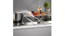 The most prominent feature of a cooktop extractor is the fact that steam and cooking vapours are captured at the height at which they arise and not at a distance above pots and pans. The technical componentry on this type of product is concealed in the cabinet down below. This has a huge practical benefit: Cooktop extractors are suitable for installation in a run of kitchen furniture installed against a wall as well as in a cooking island. Aesthetically, this represents an interesting alternative to a conventional cooktop as these products blend in seamlessly with surrounding furniture and go discretely about their work.