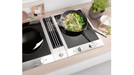 Miele CombiSet modules take into account a wide variety of cooking preferences as this pick-n-mix approach allows the combination of, say, induction hobs with a griddle or even a wok to produce a product tailored to the needs of consumers. Miele offers no fewer than four preconfigured sets containing a cooktop extractor. In each case, the extractor is always located centrally, sandwiched between the cooking modules to ensure the unimpeded extraction of steam at source. In Set 1, two induction hob units each with two rings, of which one is a casserole zone, frames a cooktop extractor. Set 2 on the other hand comprises an induction hob on the one side and a TepanYaki stainless-steel contact grill on the other. A combination of induction hob, cooktop extractor and induction wok is also possible. Last but not least, Miele also offers a set with two hob units with conventional radiant heater elements.