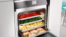 Miele combination steam ovens are prized by professional chefs and acclaimed on cooking forums for the broad range of cooking options they offer. All operating modes are available: Steam cooking, combi cooking, Fan Plus, top and bottom heat, top heat, bottom heat, grill, economy grill, fan grilling, Intensive Bake, defrosting, reheating, bottling and blanching. Alongside manual food preparation options which allow humidity levels to be defined precisely by the user, this machine also offers more than 200 automatic programmes, including low-temperature, or slow, cooking cycles. It is even possible to save favourite programmes. A food probe is a standard feature, allowing meat to be cooked to a T by monitoring its core temperature.