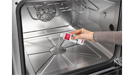 After removing all accessories, a specially formulated liquid cleaner is poured into the strainer in the base of the unit, later automatically mixed with fresh water and pumped to the top of the oven interior and sprayed uniformly around the oven by an impeller. This softens and removes soiling. The procedure is repeated automatically several times before the foam is rinsed and drained off. Should coarser soil linger on, this can be effortlessly wiped out in a similar way to residue left behind after pyrolytic cleaning in a conventional oven. The process ends with a short drying phase. Miele recommends using HydroClean every three months, or even more often if the oven is frequently used for roasting and grilling.