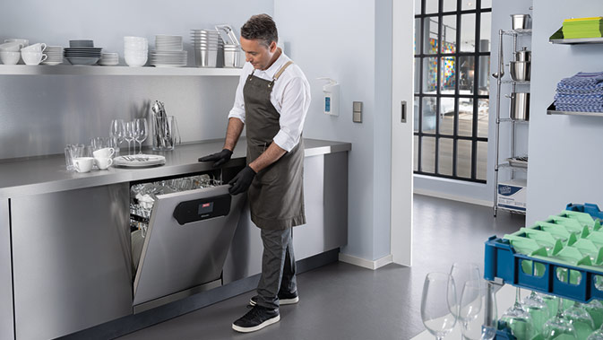 Wherever sparkling results and hygiene top the agenda, the commercial dishwashers from Miele's MasterLine series are the products of choice: The proven fresh water system takes in fresh water for each phase of the programme and uses high temperatures to remove soil and reliably deal with viruses and bacteria. In the course of everyday work, short cycles make for efficient processes. These models are ideal for hotels and restaurants.