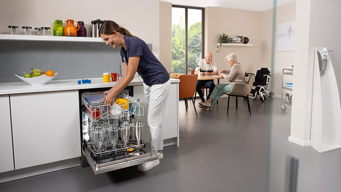 With their high main wash and final rinse temperatures, fresh water dishwashers from Miele's MasterLine series ensure the most hygienic of conditions – not least in care and nursing homes. Special-purpose inserts are available for medication beakers and feeding cups. (Photo: Miele) |