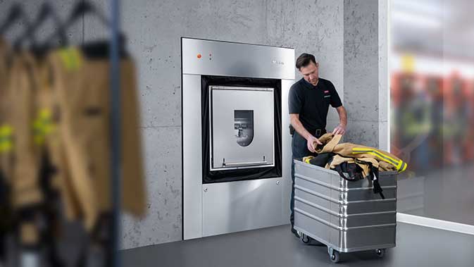 Hazardous substances to which fire-fighters are exposed via their protective clothing can seriously affect health. These include smoke, diesel fumes and asbestos, which is provably carcinogenic, as well as toxic chemical residues. Help is now at hand in the form of barrier washing machines with two doors, allowing loading and uploading in separate rooms and preventing any redeposition of soil on textiles. Miele now offers three models in different sizes – particularly designed to rise to the challenges of fire brigades and rescue services.