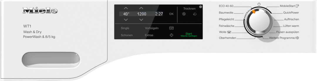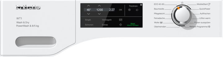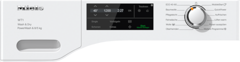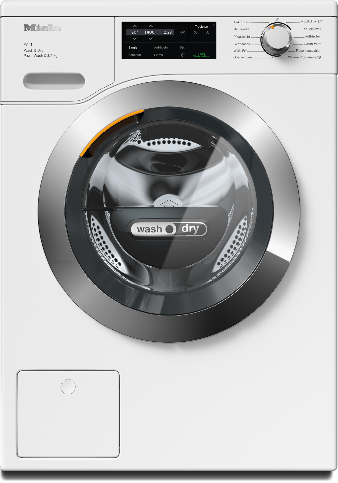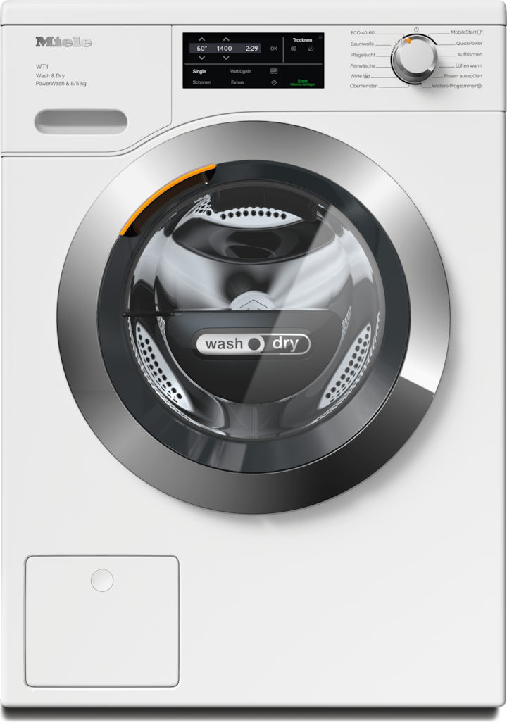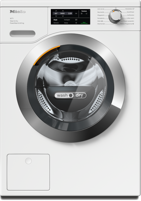 - 5.Während der Entwicklungsphase der Waschtrocknerserie WT1 hat Miele Modelle & Kernkomponenten mit 5000 Wasch- und 4000 Trockengängen (= 5 Wasch- und 4 Trockengänge p. Woche für 50 Wochen p.a.) in div. Programmen getestet. Mehr: miele.com/20years